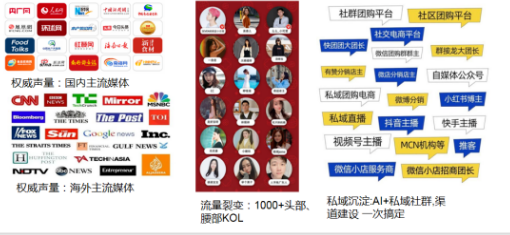 全域引爆,閉環(huán)運營。整合350+海內(nèi)外主流媒體、行業(yè)媒體、興趣電商資源,采用“權(quán)威聲量+流量裂變+產(chǎn)業(yè)深耕”營銷策略,構(gòu)建“權(quán)威背書-全域滲透-爆品孵化-私域沉淀-終端裂變”的社交興趣電商完整閉環(huán)。
